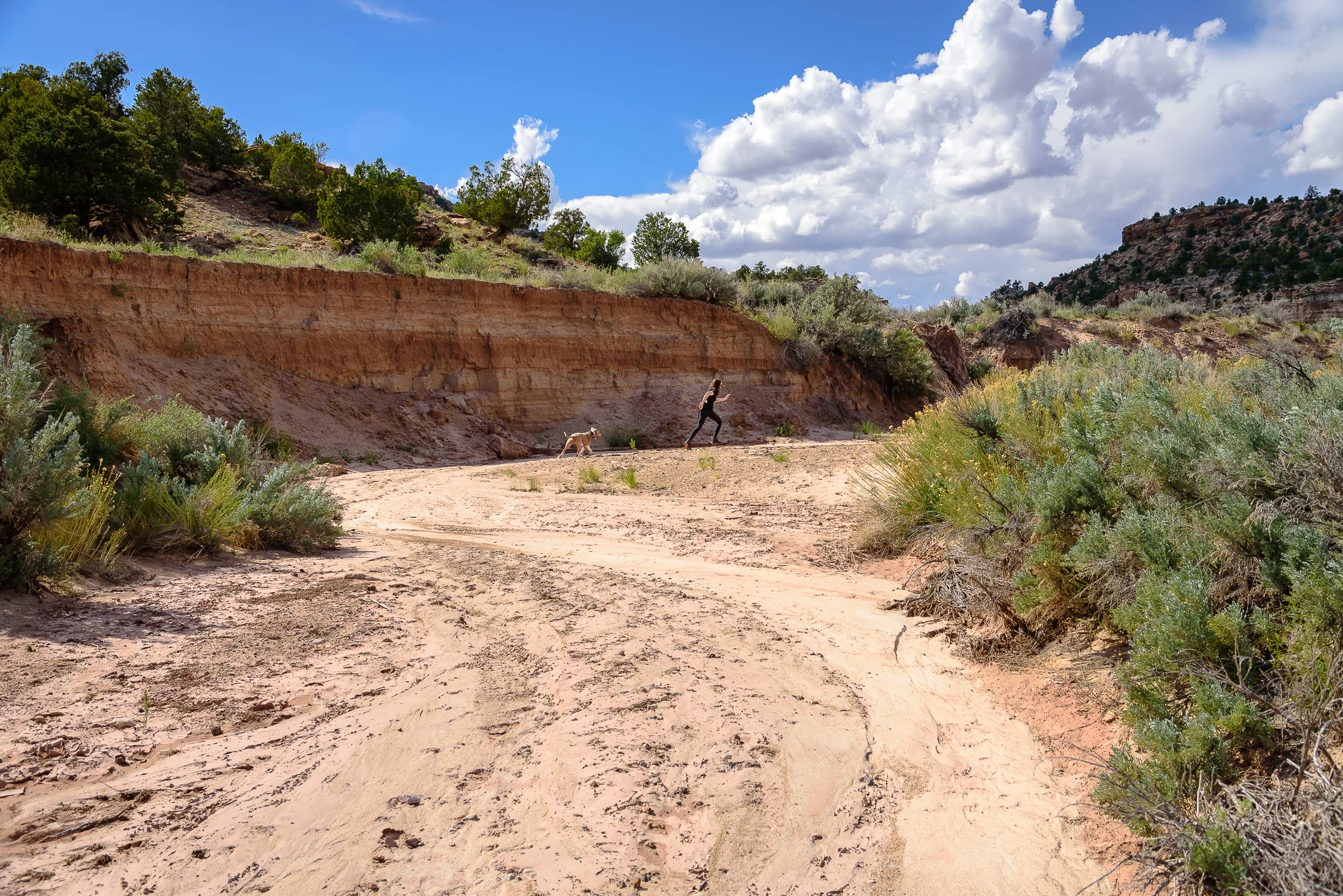 Just a girl and her dog frolicking through the Escalante River wash. Petrified Forest State Park, Escalante, UT.