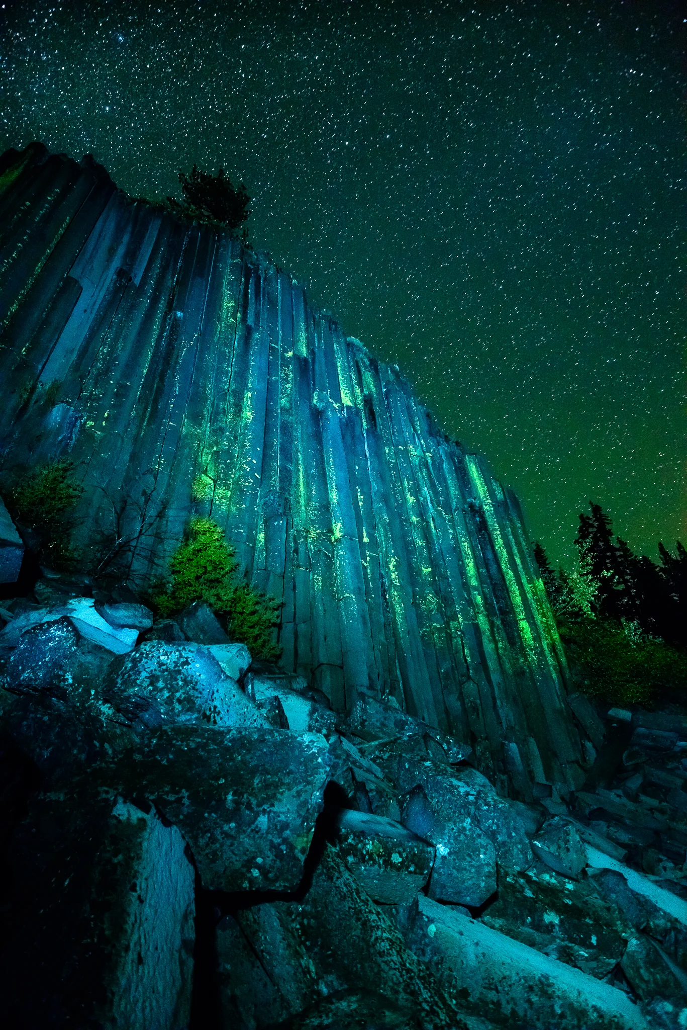 Devil's Postpile glowing under a clear and cold Sierra night.