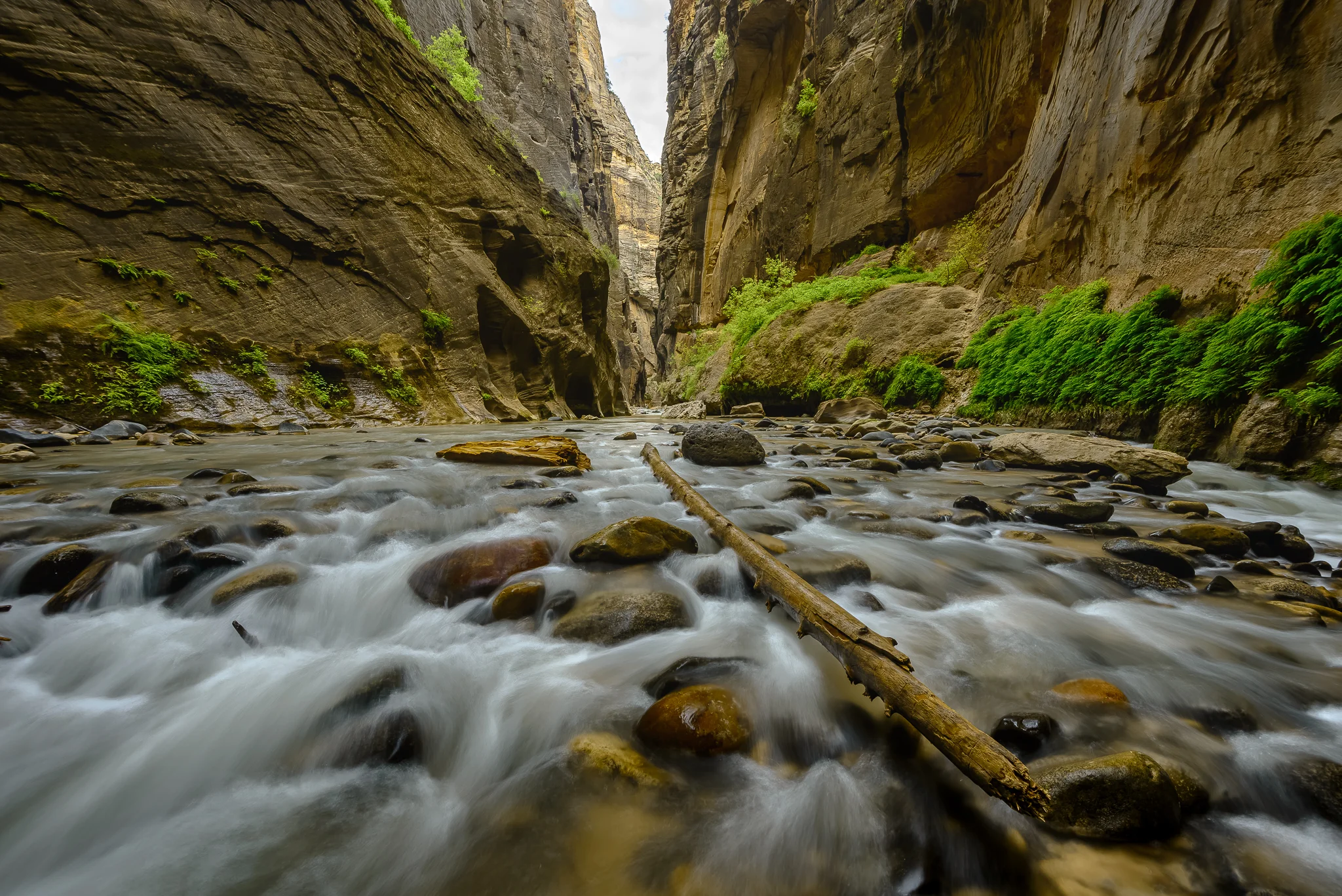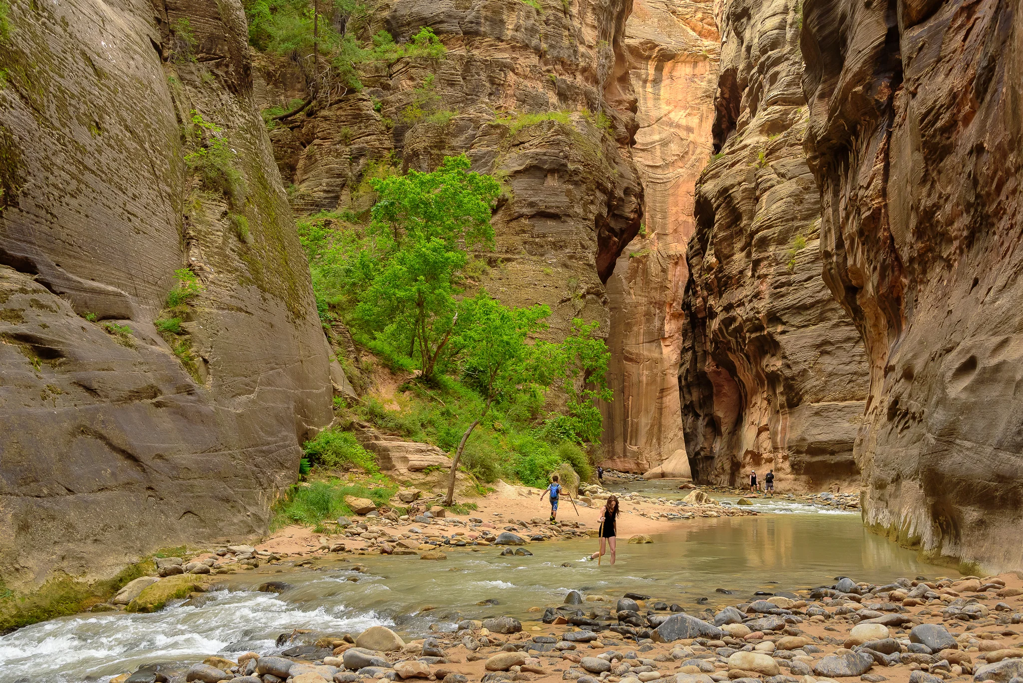 If we were going to Zion, I wasn't passing on hiking The Narrows without putting up a fight. Thankfully persuading the crew was easy and we all agreed it wasn't worth missing. Often it's nice to diversify and experiment with new routes and different adventures, but diving straight into The Narrows for a second time was something I'd been yearning for, and more importantly, was excited to share with my family. I prepped them on the challenges of the terrain, the risks of the weather, and advised everyone on what gear to use. With the help of some clunky canyoneering boots and gnarled wooden walking sticks, Zion Adventure Company set us up for safety and success. Foremost on our mind was safety, as entering any slot canyon poses serious risks, especially in monsoon season. While The Narrows only flash floods a few times a year, one of those times was a week prior and park officials were giving plenty of reminders about safety in the canyon. With some overhead clouds swooping in and out, we hedged our bets and took the world famous hike head on.